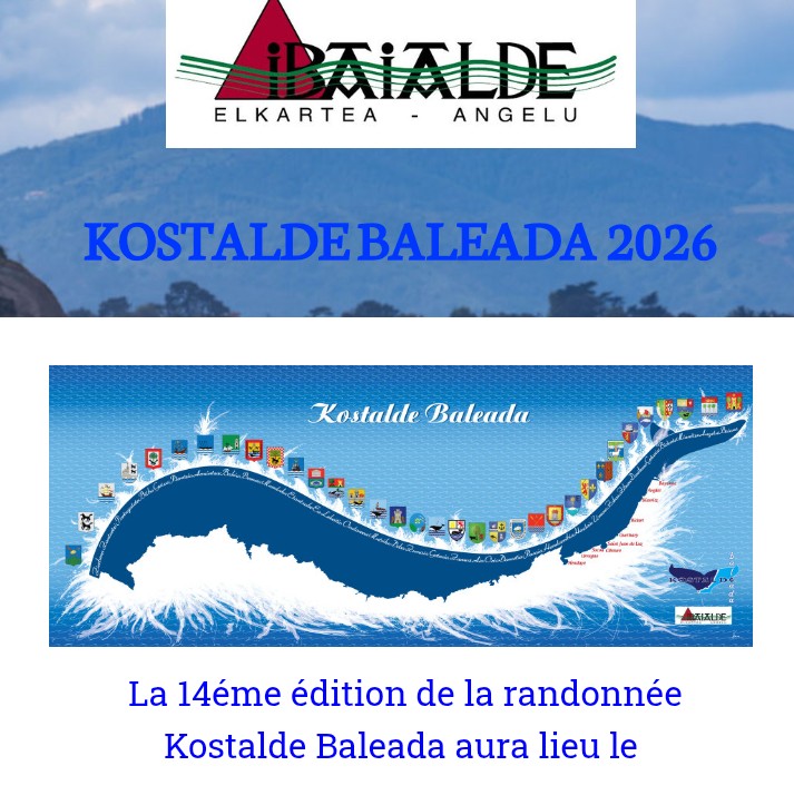 Publié le 24 janvier 202624 janvier 2026Kostalde baleada – Dimanche 19 Avril Marche 28 kms de Ciboure à Anglet Attention : Places limitées Inscriptions en ligne uniquement le samedi 28 février à 9 h